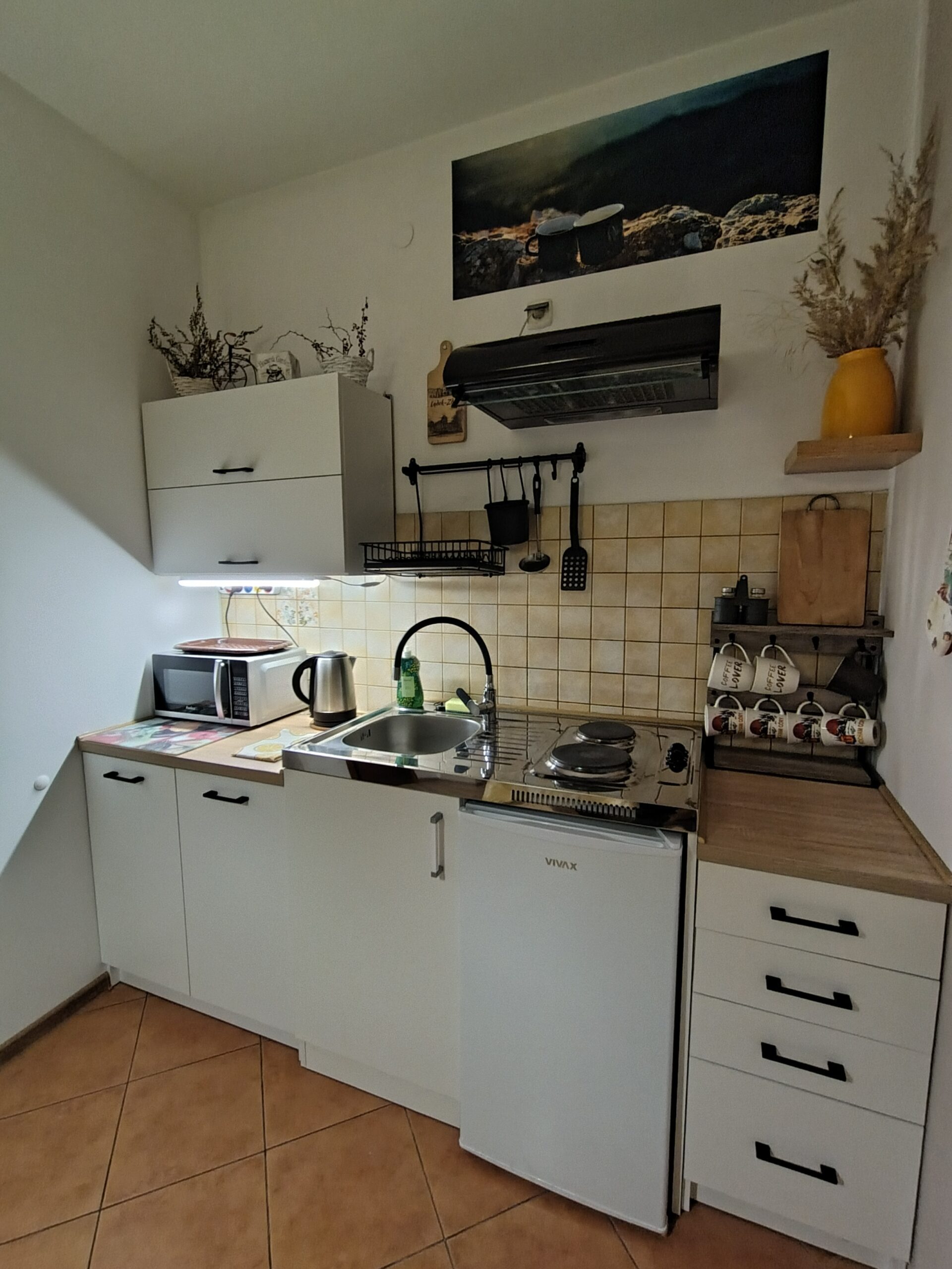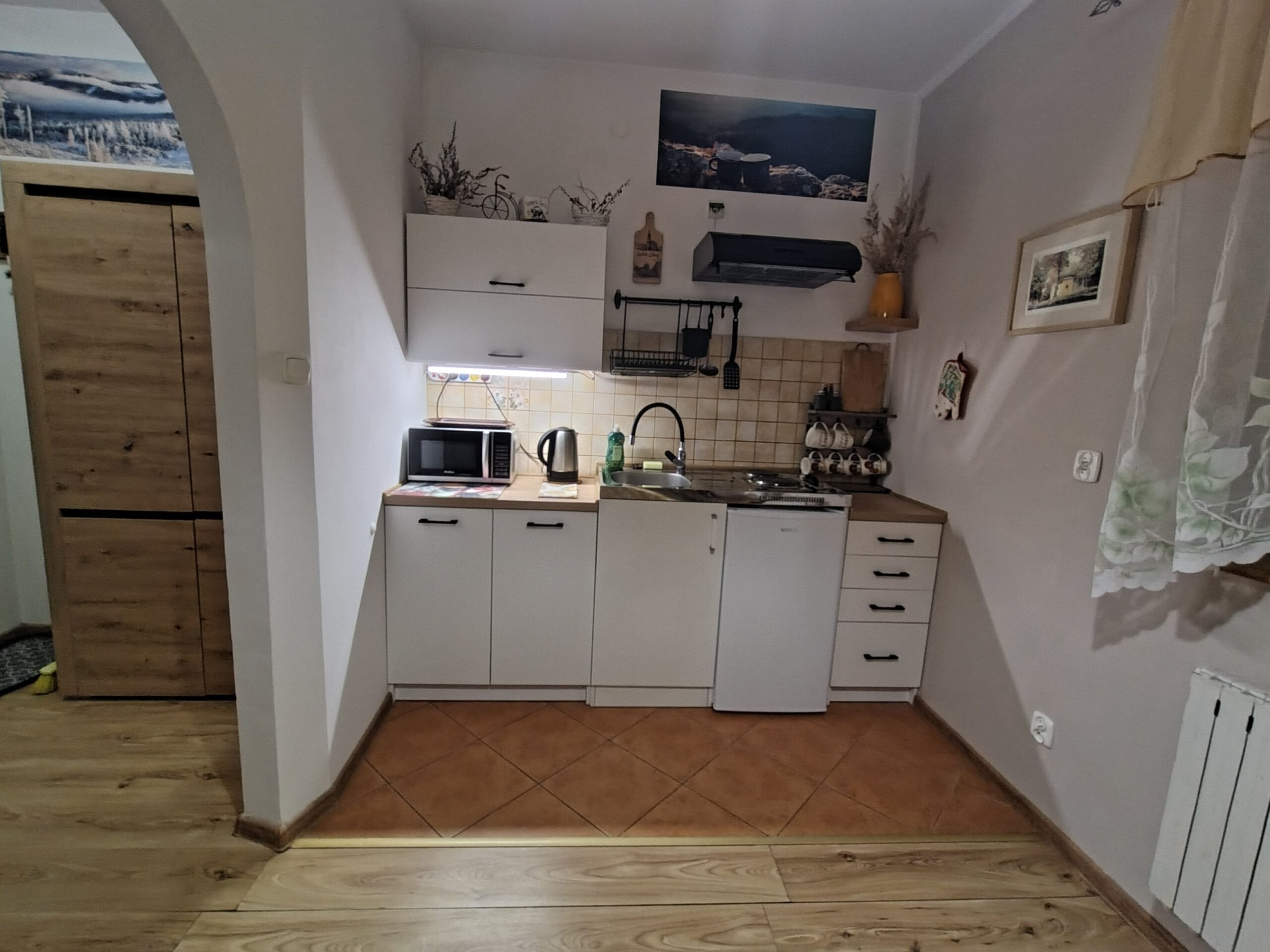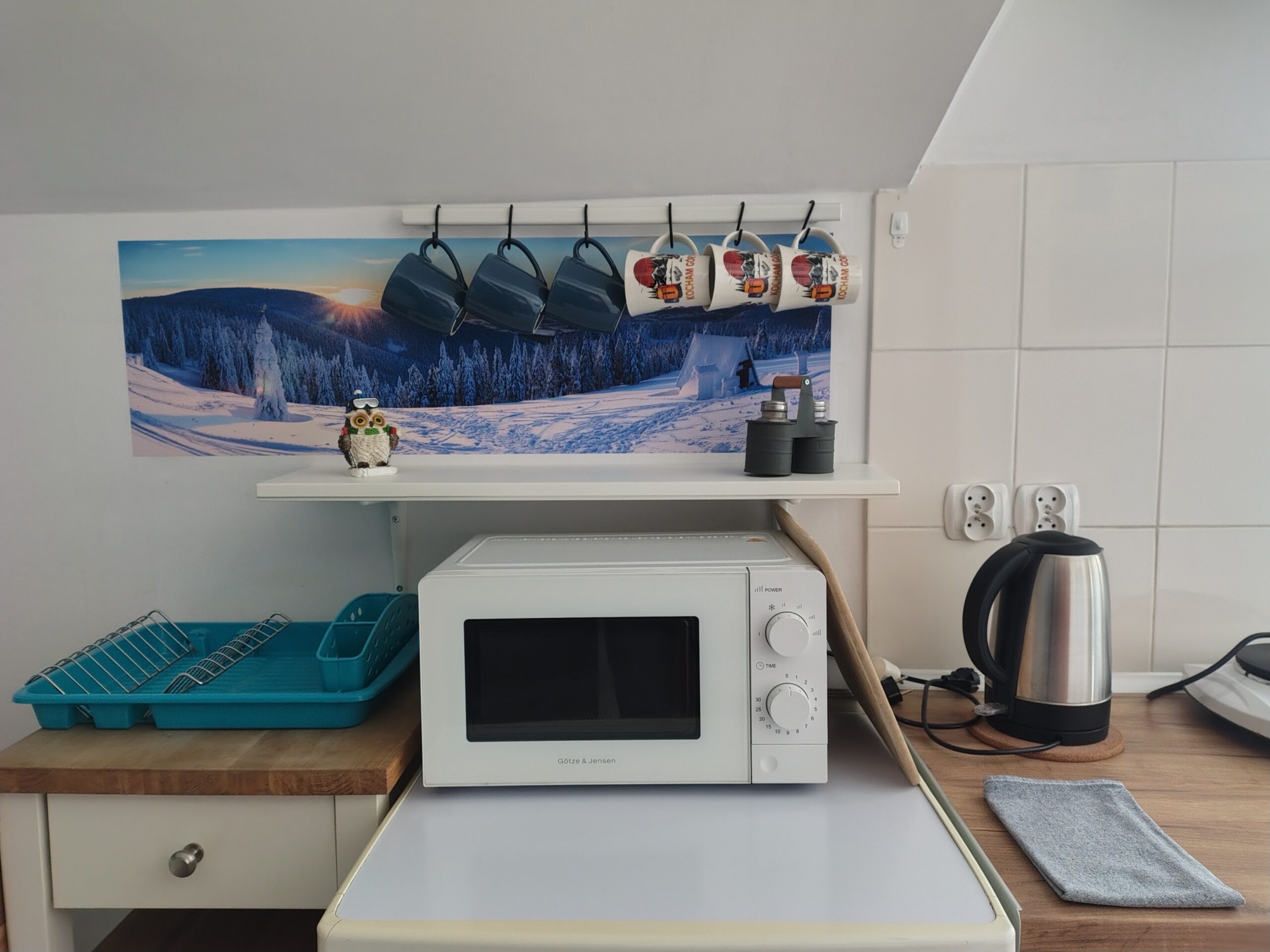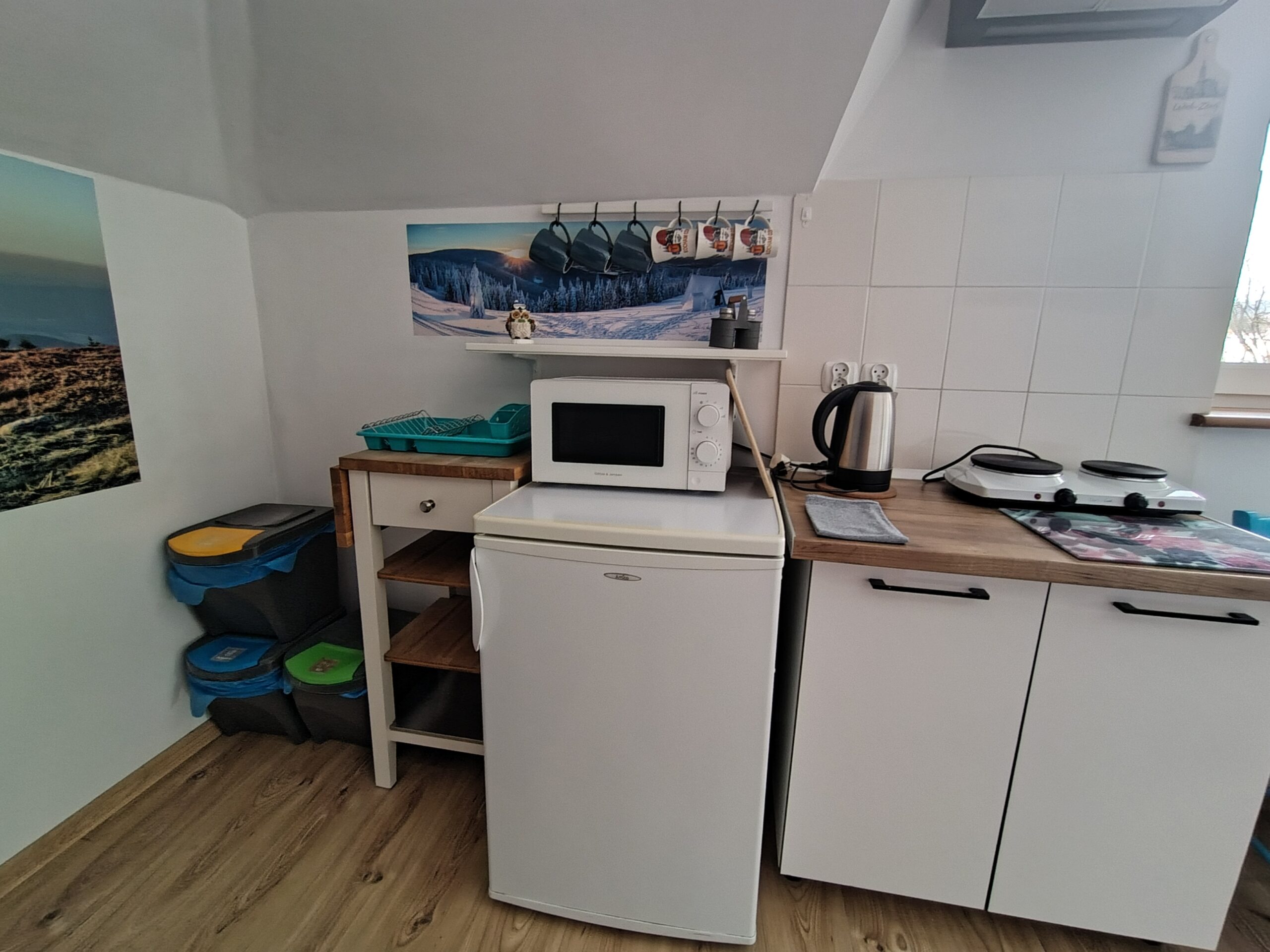 - kuchenka, lodówka, kuchenka mikrofalowa, czajnik elektryczny i naczynia