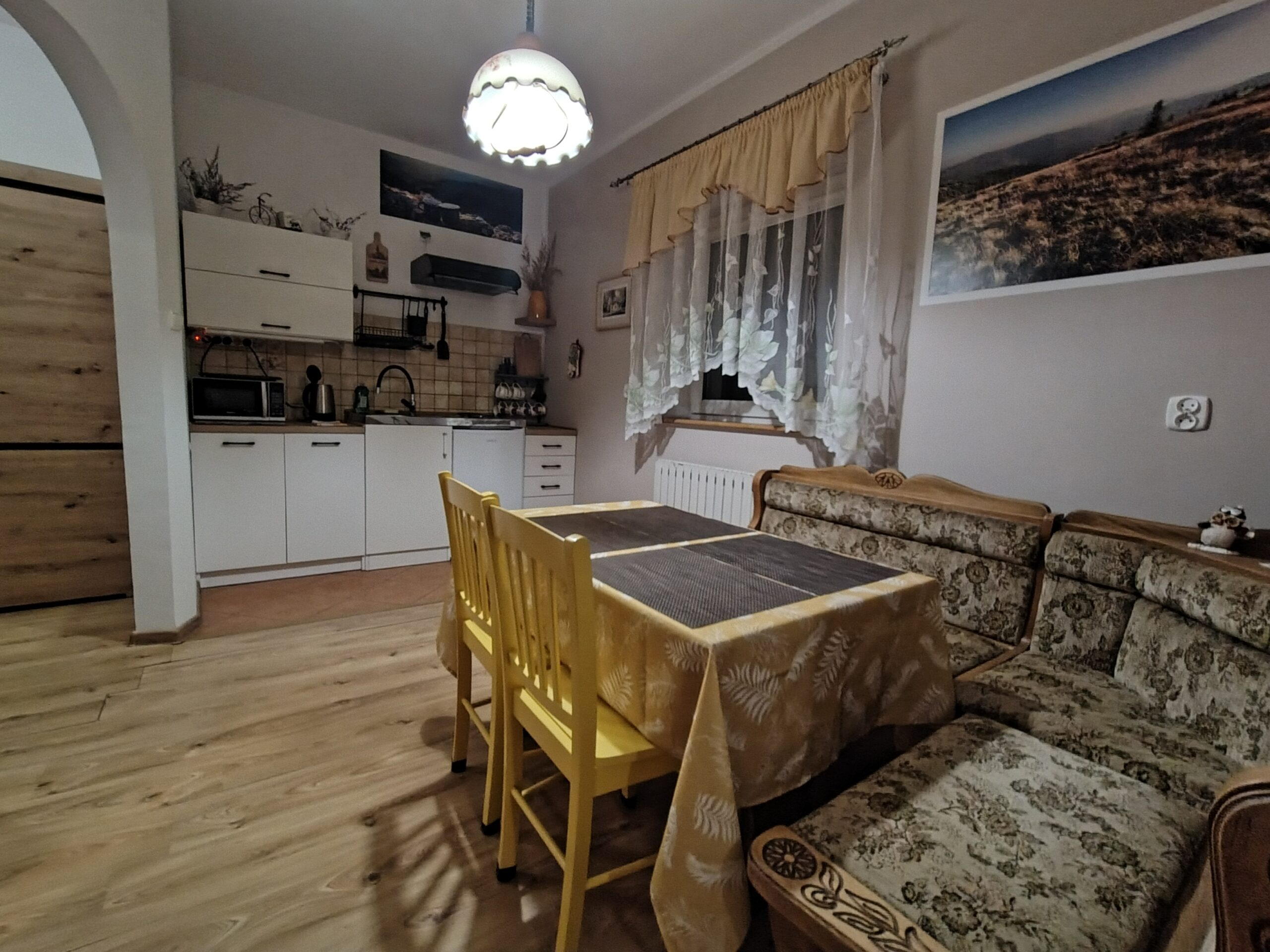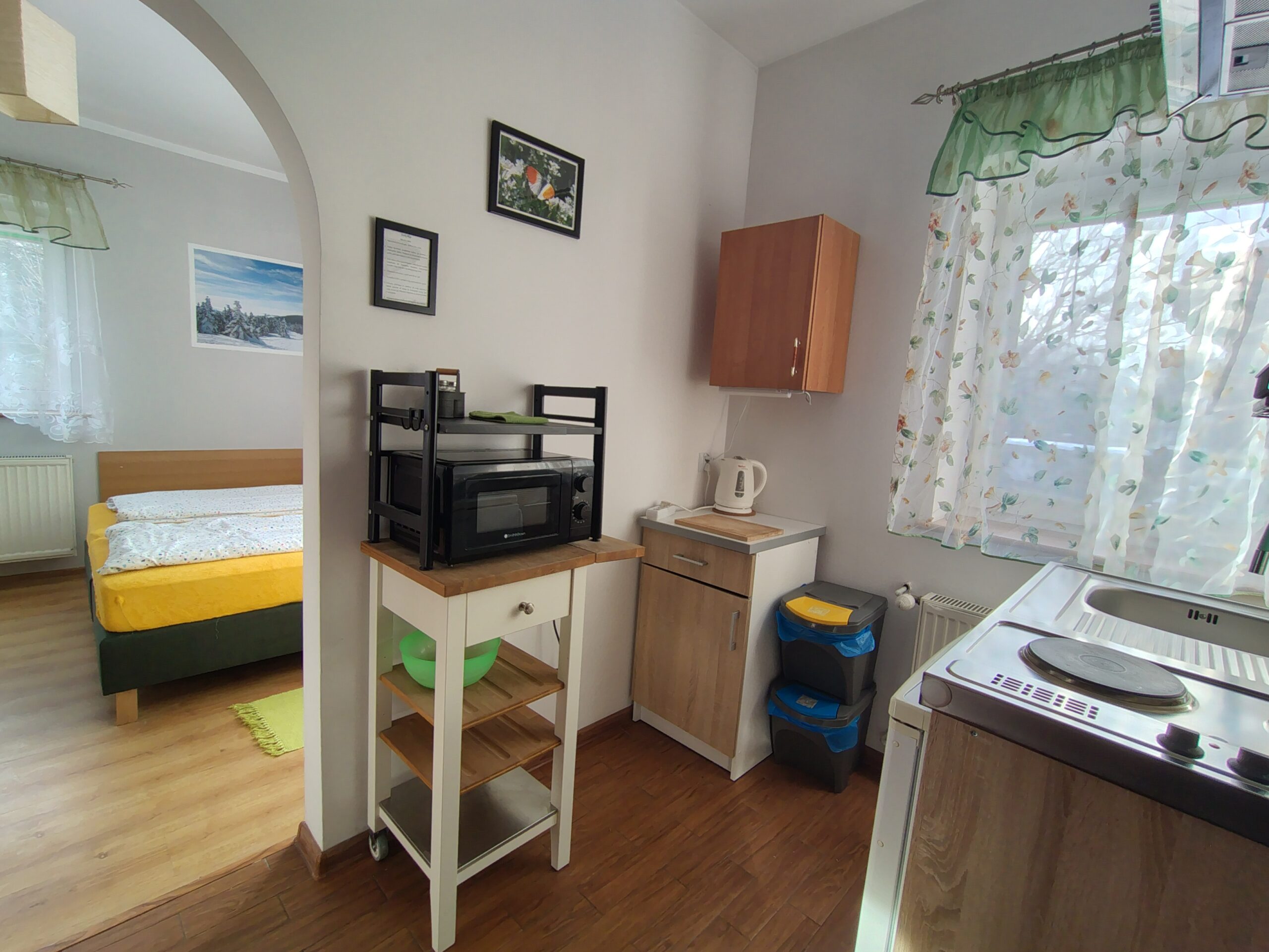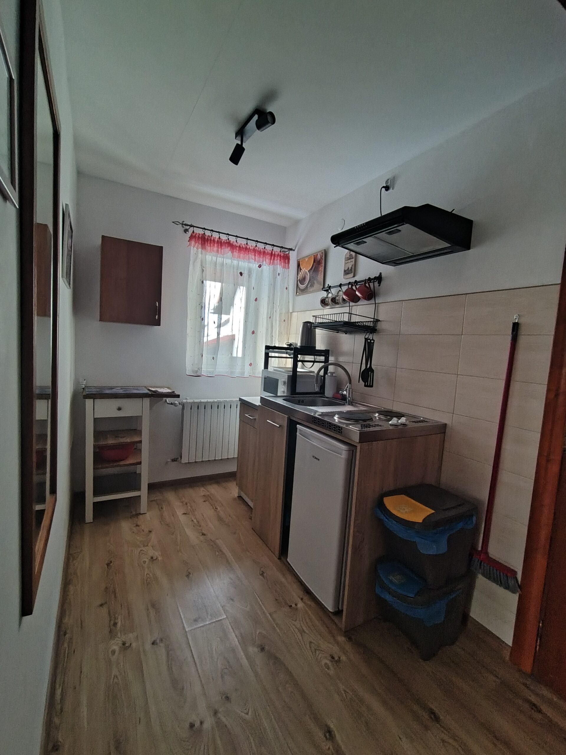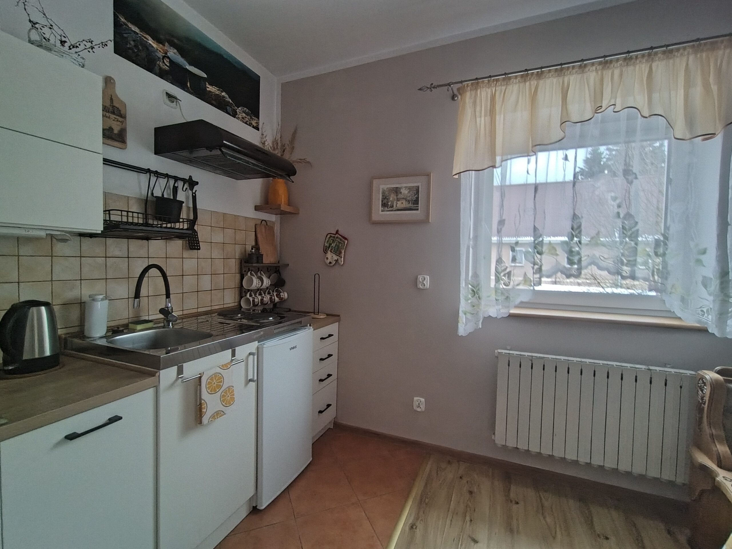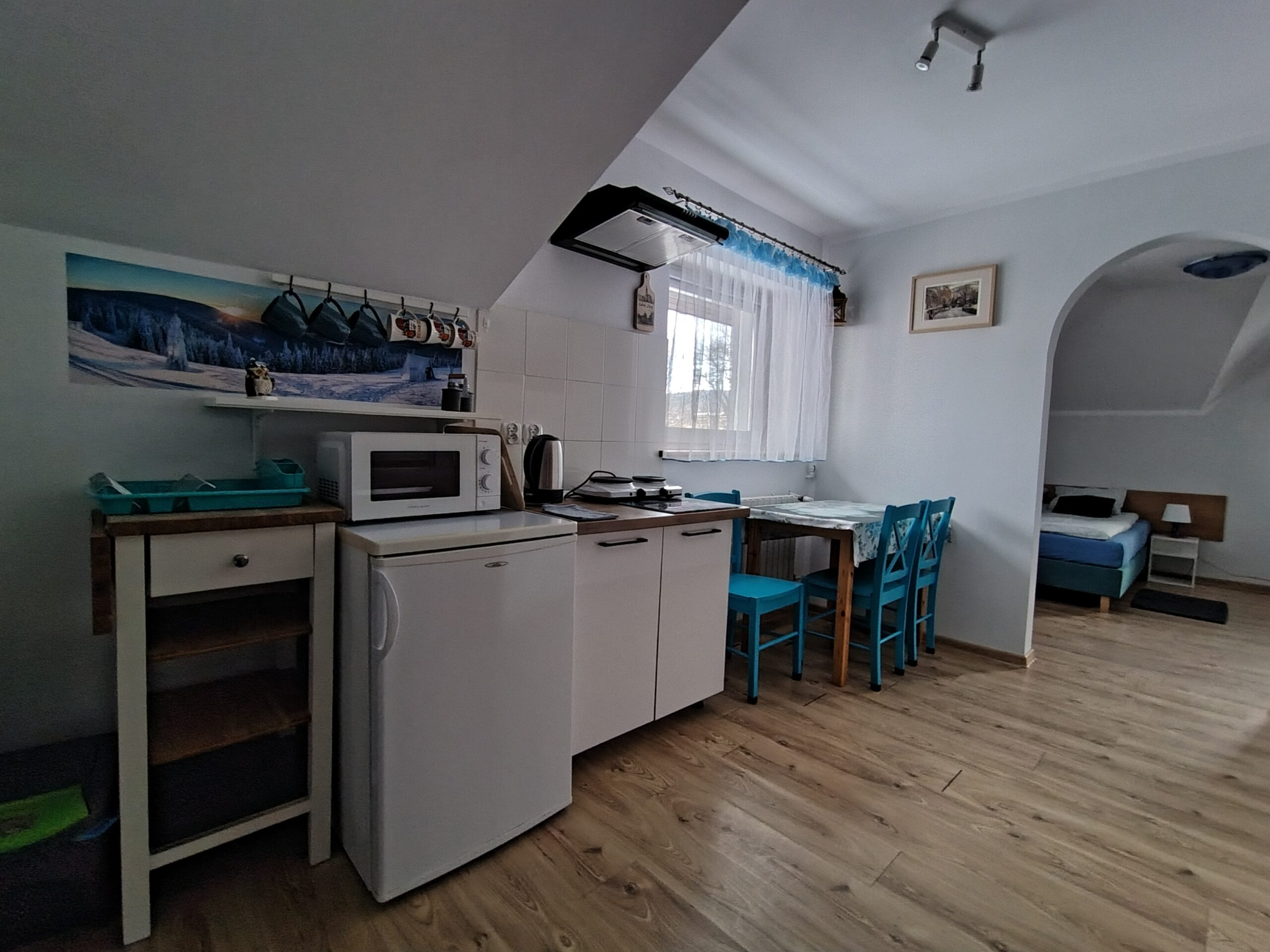 - kuchenka, lodówka, kuchenka mikrofalowa, czajnik elektryczny i naczynia